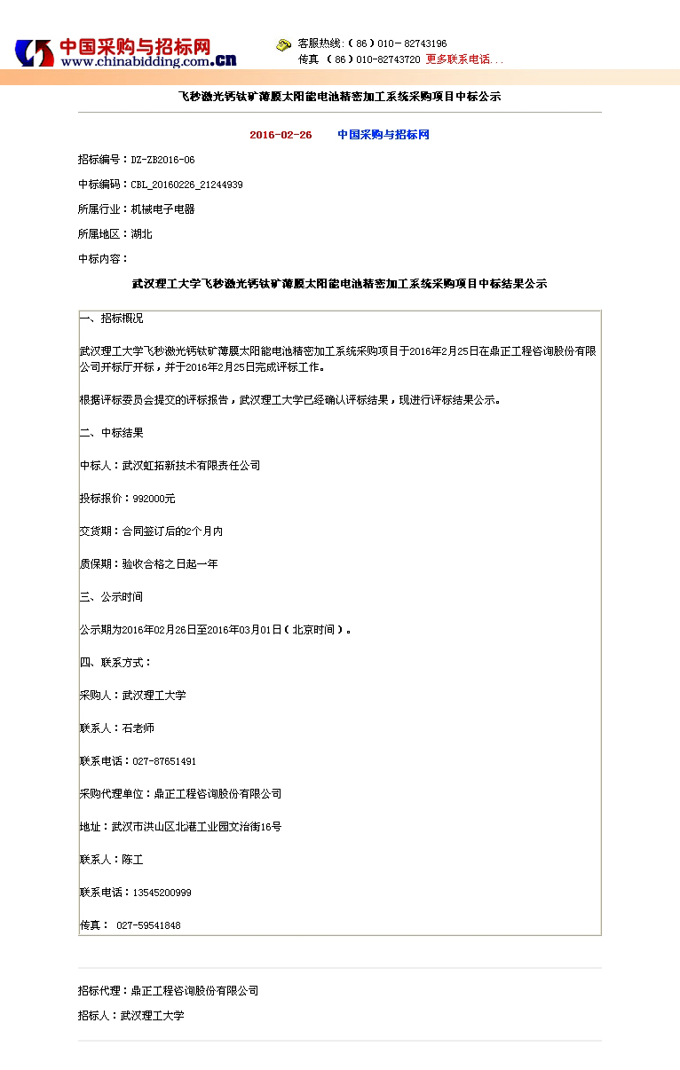 飛秒激光鈣鈦礦薄膜太陽能電池精密加工系統(tǒng)采購項目中標公示