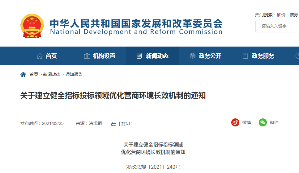 國家發(fā)展改革委:關(guān)于建立健全招標投標領(lǐng)域 優(yōu)化營商環(huán)境長效機制的通知