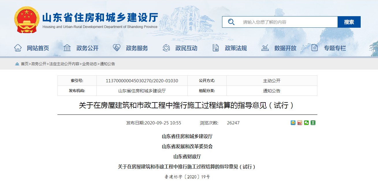 2020年9月17日,山東省住房城鄉(xiāng)建設(shè)廳、省發(fā)展改革委、省財(cái)政廳三部門聯(lián)合印發(fā)《關(guān)于在房屋建筑和市政工程中推行施工過程結(jié)算的指導(dǎo)意見(試行)》,通過規(guī)范結(jié)算行為,縮短結(jié)算周期,減輕企業(yè)負(fù)擔(dān):