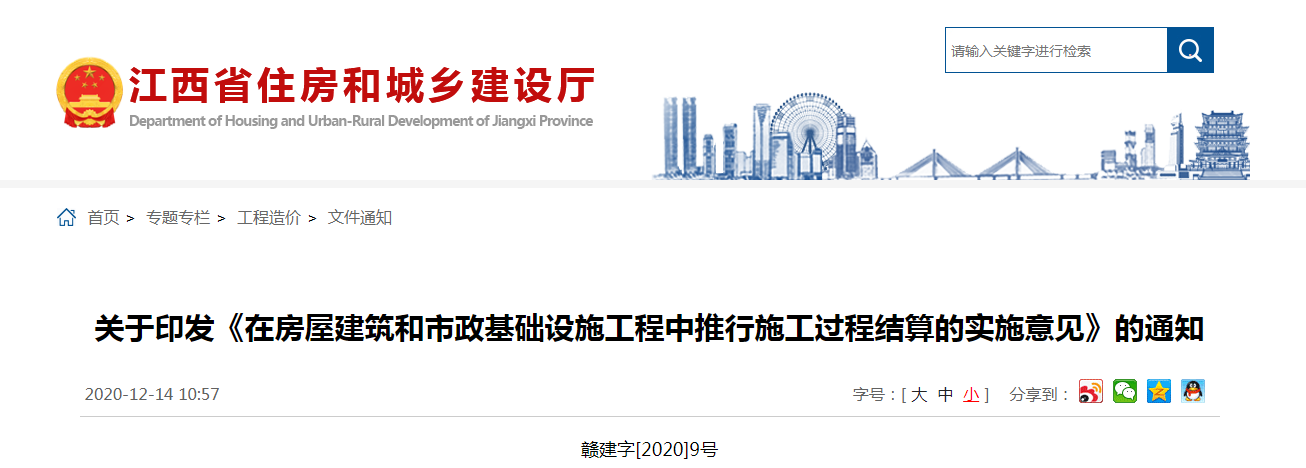 2020年12月14日,江西省住建廳發(fā)布通知,印發(fā)《在房屋建筑和市政基礎(chǔ)設(shè)施工程中推行施工過程結(jié)算的實(shí)施意見》,自下文之日起施行。