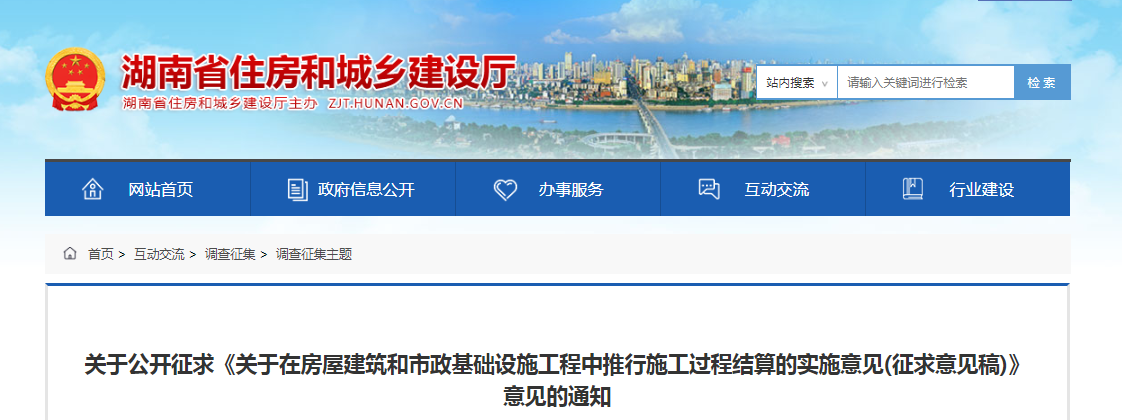 2020年5月28日,湖南省住建廳發(fā)布《關(guān)于在房屋建筑和市政基礎(chǔ)設(shè)施工程中推行施工過程結(jié)算的實(shí)施意見(征求意見稿)》,在省內(nèi)房建、市政項(xiàng)目中全面推行施工過程結(jié)算。