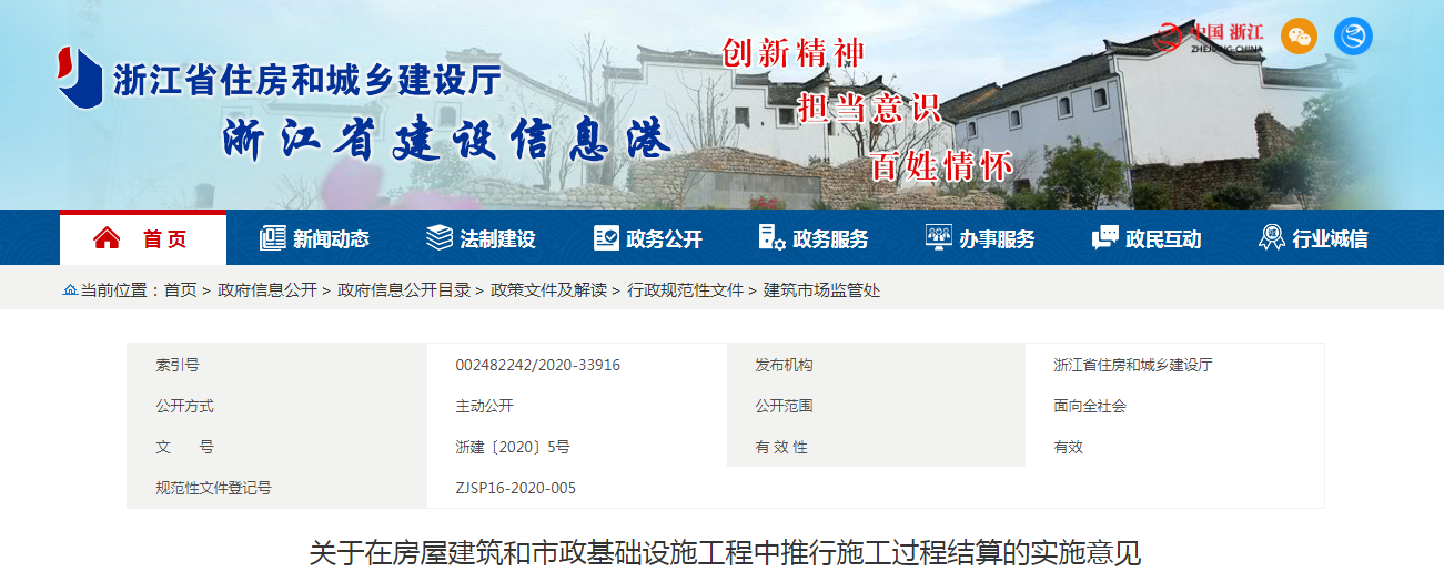 2020年5月20日,浙江省住建廳發(fā)布《關(guān)于在房屋建筑和市政基礎(chǔ)設(shè)施工程中推行施工過程結(jié)算的實(shí)施意見》:自6月20日起,在全省房建和市政項(xiàng)目中全面推行施工過程結(jié)算。