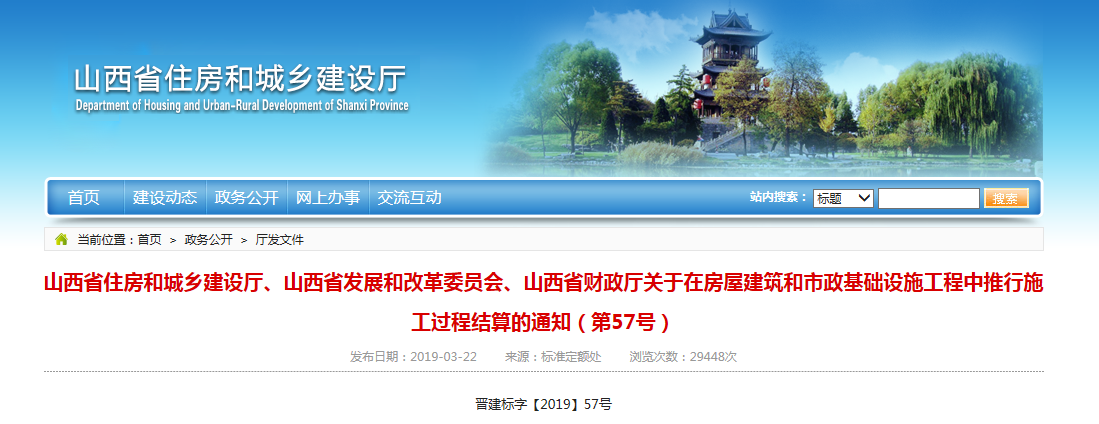 2019年3月22日,《山西省住房和城鄉(xiāng)建設(shè)廳、山西省發(fā)展和改革委員會(huì)、山西省財(cái)政廳關(guān)于在房屋建筑和市政基礎(chǔ)設(shè)施工程中推行施工過程結(jié)算的通知(第57號(hào))》(以下簡稱《通知》)發(fā)布,從5月1日起,在房建和市政工程中推行施工過程結(jié)算: