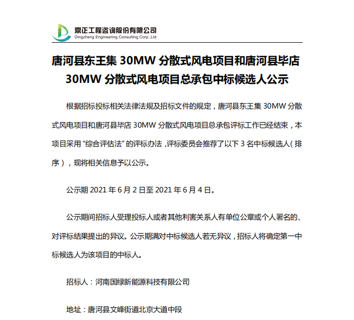 唐河縣東王集30MW分散式風電項目和唐河縣畢店30MW分散式風電項目工程建設監理服務 中標候選人公示