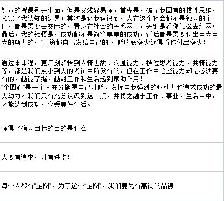 開堂的第一節(jié)課,他以《打開企圖心》為主題,以提問為主的方式,激發(fā)線上線下的學(xué)員深入思考:我們?yōu)楹味鴬^斗?我們因何而得到?既不是秀才(編者注:此語境下的含義為生活優(yōu)渥者)也不是落榜者(編者注:此語境下的含義為因失敗而發(fā)憤圖強者)的我們又當(dāng)以什么作為自身前進(jìn)的動力?……