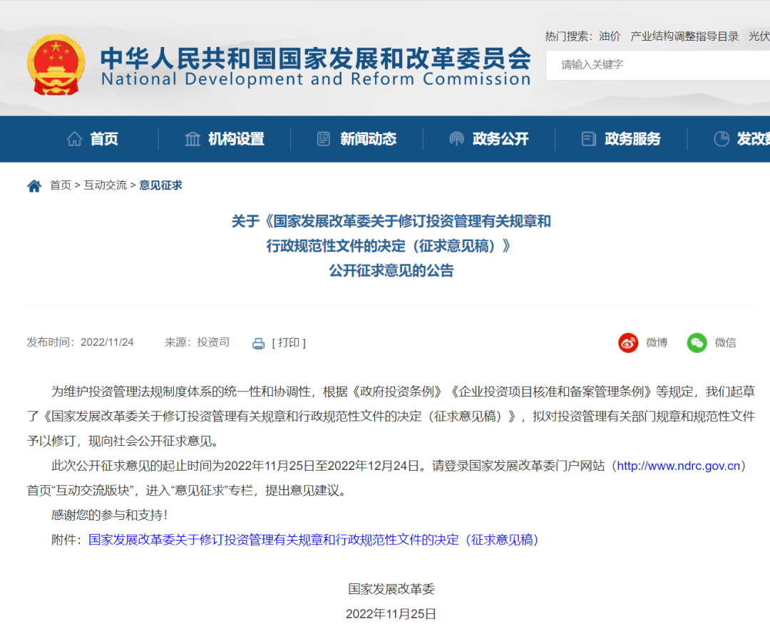 國家發改委:投資管理有關規章和行政規范性文件將修訂