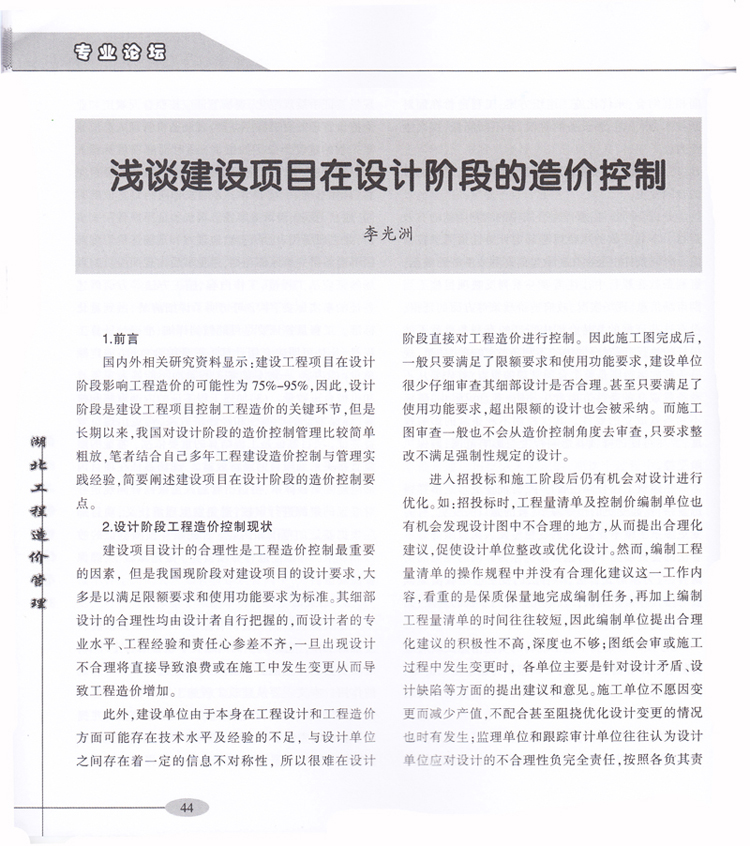 我司李光洲同志論文《淺談建設項目在設計階段的造價控制》發表