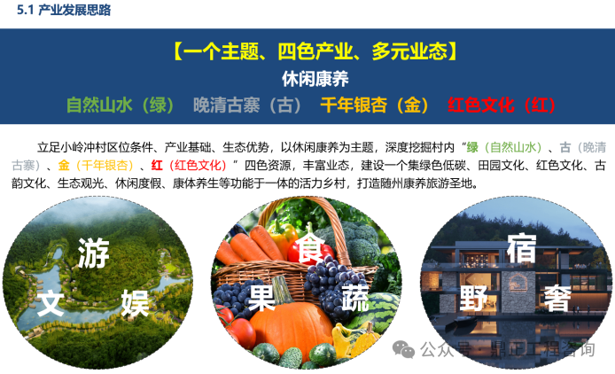 其中,雙河村通過發(fā)揮特色農(nóng)業(yè)產(chǎn)業(yè)優(yōu)勢建設農(nóng)業(yè)品牌,延伸農(nóng)業(yè)加工產(chǎn)業(yè)鏈開啟創(chuàng)收新征程,積極發(fā)展鄉(xiāng)村休閑業(yè)打造詩意田園水鄉(xiāng),主要打造田園綜合體、濱河休閑體驗,拓展農(nóng)業(yè)休閑旅游業(yè)態(tài)。泉水寺村重點結合國家級專用汽車和應急裝備檢測研發(fā)基地的建設基礎,構建以產(chǎn)業(yè)基地配套服務為主導,以生態(tài)種養(yǎng)、休閑農(nóng)業(yè)為特色的產(chǎn)業(yè)體系。小嶺沖村重點整合“綠(自然山水)、古(晚清古寨)、金(千年銀杏)、紅(紅色文化)”四色資源,構建“綠+古+金+紅”四色產(chǎn)業(yè),打造品質(zhì)活力鄉(xiāng)村旅游。九口堰村重點以豐富的紅色文化、自然資源為基礎,以紅色文化體驗為主導產(chǎn)業(yè),以文化帶動旅游,拓展紅色體驗、康養(yǎng)度假等產(chǎn)業(yè),打造全國紅色教育示范基地。