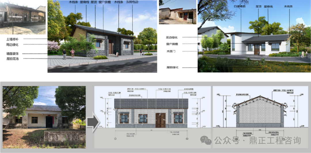 在建筑美化方面,通過建筑整體色彩協(xié)調(diào)、立面美化、增加裝飾、宅前屋后綠化等措施,實現(xiàn)對建筑的整改。其中對于歷史建筑風貌整治,要在不改變歷史建筑原狀的原則下,對民居進行部分修繕。同時整治歷史建筑的周圍環(huán)境,提升整體環(huán)境質(zhì)量。