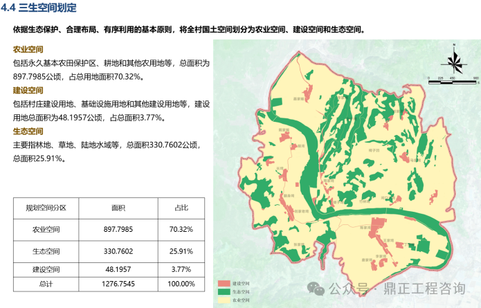 如雙河村結合“田、宅、水、林、產(chǎn)、景”等要素優(yōu)化用地結構,集約土地利用,全要素管控。落實上位空間管控、堅持農(nóng)業(yè)生態(tài)優(yōu)先、劃定底線保護控制線。依據(jù)生態(tài)保護、合理布局、有序利用的基本原則,將全村國土空間劃分為農(nóng)業(yè)空間、建設空間和生態(tài)空間,明確生態(tài)保護、農(nóng)業(yè)生產(chǎn)、村莊建設的主要區(qū)域。同時,對三類空間制定管控要求,強化村莊的底線管控。
