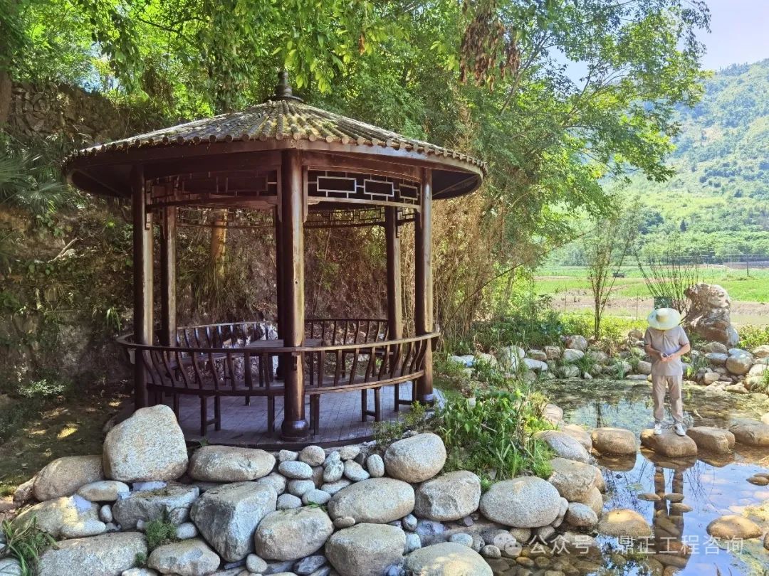 水景觀水文化打造:通過深挖相公泉?dú)v史文化內(nèi)涵,進(jìn)行本地印象提煉。“相公”一詞在古代,是妻子對(duì)丈夫的稱呼,也是君子、生員(秀才、相公)、宰相的另一種叫法。君子愛茶,沏茶品茗,修煉品性,以茶可雅志,茶是象征著塵世的純潔。設(shè)計(jì)從自然山水出發(fā),落位于閑情逸致設(shè)計(jì)基調(diào),泉眼處采用題字景石配上一棵姿態(tài)旖旎的紅豆,視線端頭一幅竹影錦鯉、花木跌水的畫面映入眼簾,兩側(cè)的樹木林立,開合有致,整個(gè)節(jié)點(diǎn)的中心是一座圓頂茶亭,在亭中,一壺清茶問道,仿佛拉近了古今往事,也增加了場(chǎng)地的記憶,呈現(xiàn)出 “千年古樹頻招手,萬(wàn)年清泉溢清香”的意境。