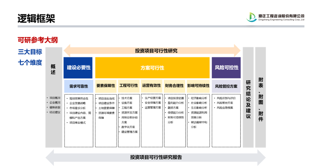 《可行性研究報告編制大綱(2023年版)》的頒布實施,對于我國新時代投資項目科學決策、推動實現高質量投資具有里程碑意義,鼎正作為一家綜合性咨詢企業,多年來深度服務湖北省及下屬多個縣市區的經濟建設,在全過程工程咨詢、投融資咨詢、專項債咨詢、國債咨詢、PPP咨詢等,積累了良好的理論基礎與品牌口碑,并從咨詢實踐中摸索出一套“向前、向后、向綠色”的高質量咨詢產品線,能夠提供高質量全方位的咨詢服務。